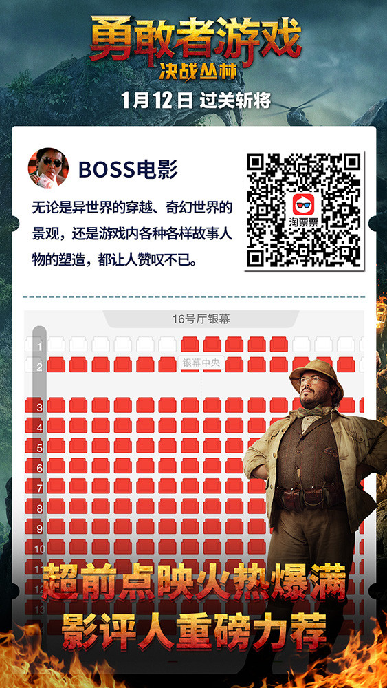 影片在北美上映四周依然坚挺,单日票房持续力压《星球大战8》,累计票房超过2.4亿美元。同时,《勇敢者游戏》于1月7日在国内41座城市开启百场点映活动,当日以84.2%的超高上座率成为卖座冠军,更是在猫眼和豆瓣上取得了9.0和7.5的超高评分。首批观众更迫不及待表达对这部电影的喜爱,“全程无尿点”“全场笑声此起彼伏”这样的评论比比皆是。更有人放言:刺激又欢乐的《勇敢者游戏:决战丛林》毫无疑问将成为开年第一合家欢电影。