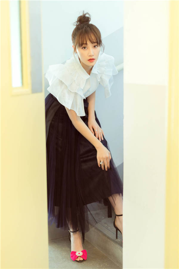 蓝盈莹穿荷叶边衬衫尽显青春原力Feel