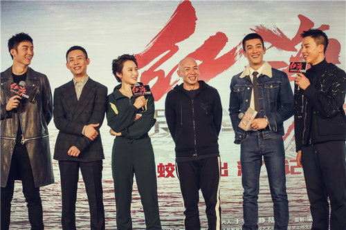 当主持人让各位主创讲述自己参演这部电影最大的感受时,蒋璐霞爆料到,刚进组就被林超贤导演“逼迫”剃了板寸,加之她饰演的机枪手佟莉在整部影片中拿的武器是最重的,因此要不断健身,才能保证自己不会“掉队”。