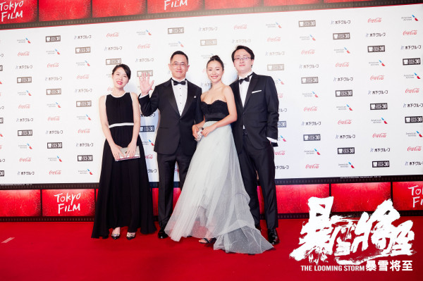 江一燕+导演董越+制片人肖乾操(右一)+执行制片人罗艳(左一)第30届东京国际电影节于今日正式开幕,作为唯一入围本届电影节主竞赛单元的华语片,《暴雪将至》惊艳亮相东京。导演董越、女主角江一燕等主创出席