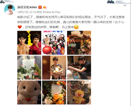 《羞羞的铁拳》票房突破20亿 艾伦微博发福利暖心依旧