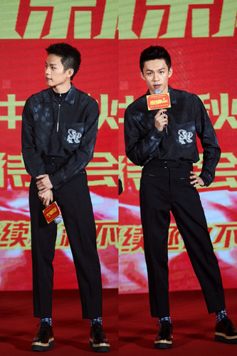 大鹏 导演,大鹏、乔杉 、娜扎、李鸿其、韩童生 、曲隽希主演的喜剧电影《缝纫机乐队》昨日在北京召开电影发布会,发布会当天,李鸿其身穿黑色印花衬衣、直筒九分裤搭配蓝白格纹袜子亮相现场,酷劲十足。