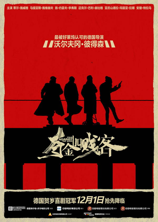 德国贺岁电影《夺金四贱客》今日首度曝光先导海报和预告片,这部由德国国宝级导演沃尔夫冈·彼德森执导的超级喜剧电影,将于12月1日隆重上映。海报主色红黑相搭,冷酷而不失滑稽,让人一眼辨识出德国老戏骨的卖萌耍酷风格,这部摘取了德国喜剧票房年度桂冠的巨作,势必带领中国观众掀起前所未有的观影体验。